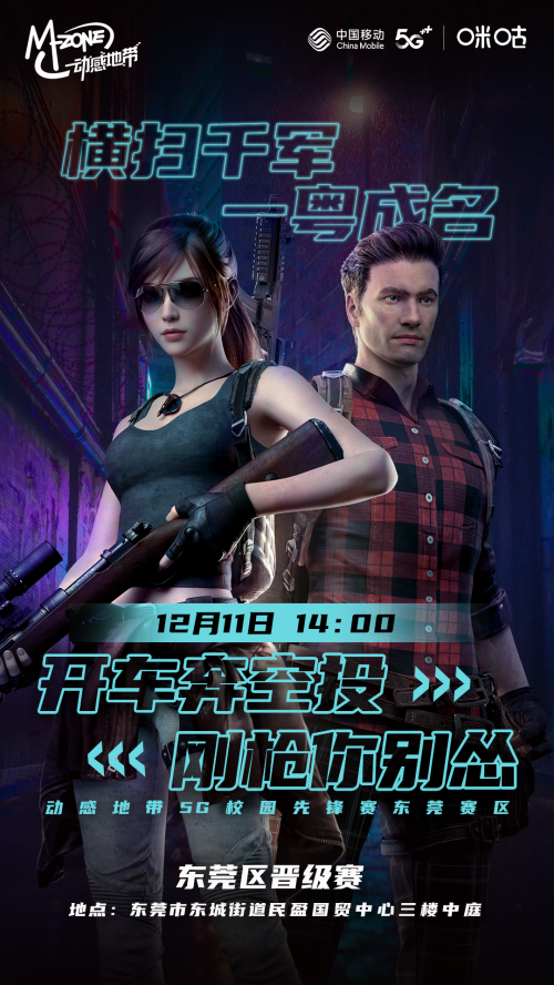 此次赛事将于东莞市东城街道民盈国贸中心三楼中庭全面展开,同时全程线上直播,战绩赛况请关注“动感地带5G校园先锋赛东莞赛区”虎牙直播间,或亲临现场观战。