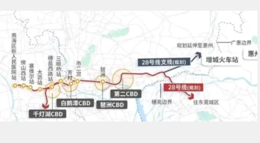 综合已知的规划信息来看,28号线将串联了佛山东平CBD、广州白鹅潭CBD、琶洲电子商务区、第二中央商务区、新塘东部商务区、松山湖高新区以及东莞万江商务区等未来城市最具活力和发展的区域。