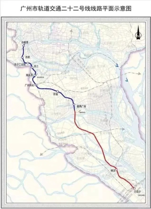 截至2020年12月31日,22号线的土建工程已经完成56%。线路定位是时速160公里的市域快线,将实现南沙、番禺、荔湾与广州南站的快速轨道交通联系,并增强广州南站的综合交通枢纽功能。该线路运营初期,万顷沙至番禺广场段将与18号线共线运营。值得注意的是,22号线未来将与18号线剥离,自番禺广场往东南方向延伸至南沙。