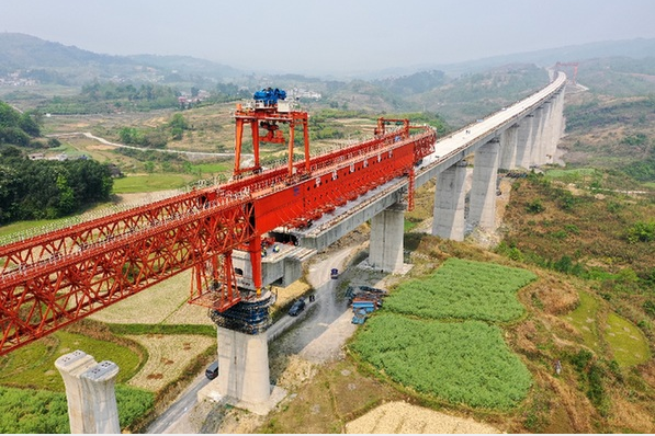 4月1日,最后一段节段梁在架设中(无人机照片)。当日,由中铁四局承建的贵州省独山县贵南高铁银坡河特大桥节段梁全部架设完成,为大桥如期完工奠定基础。据了解,贵南高铁设计时速350千米,是我国“八纵八横”高速铁路主通道包头至海口通道的重要组成部分。(来源: 经济参考报)