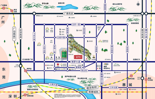 项目距离惠州北站约10公里,约15分钟车程,赣深高铁预计2021年底通车, 届时项目将通过惠州北站实现2站到东莞,3站到深圳,真正实现工作在莞深,生活在博罗。