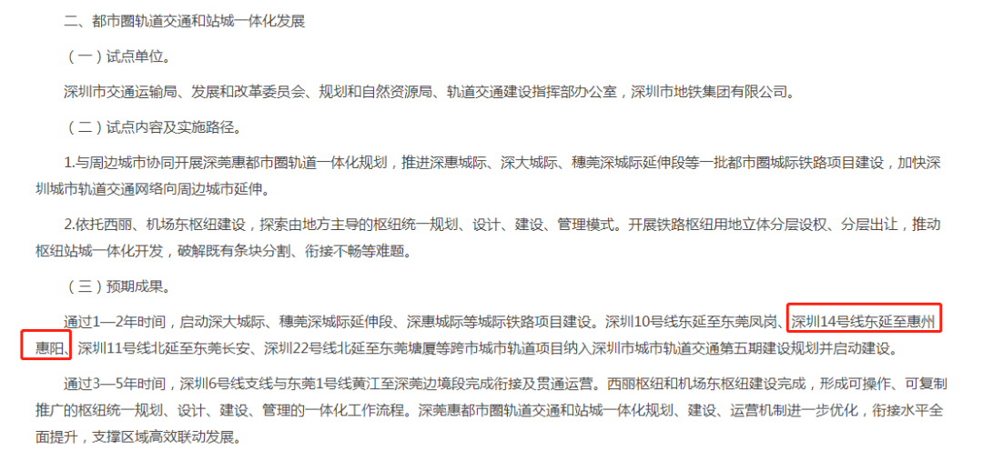 文件还提到,1-2年时间,深圳10号线东延至东莞凤岗、深圳14号线东延至惠州惠阳、深圳11号线北延至东莞长安、深圳22号线北延至东莞塘厦等跨市城市轨道项目,纳入深圳市城市轨道交通第五期建设规划并启动建设。