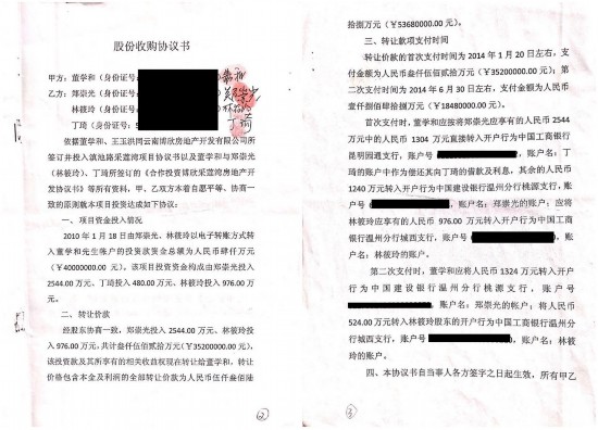 2013年12月2日,董学和与郑崇光、林筱玲、丁琦签订《股份收购协议书》约定:郑崇光、林筱玲将股权转让给董学和,转让总价为5368万元——包含本金3520万元及利润1848万元。其中,郑崇光享有3868万元(本金2544万元,利润1324万元)、林筱玲1500万元(本金976万元,利润523万元)。协议还约定,因郑崇光欠丁琦1304万元,应付郑崇光3868万元中的1304万元直接转入丁琦的账户。据了解,这1304万元欠款实际是丁琦母亲李小婉(昆明高新技术产业开发区总工会常务(原)副主席)放到郑崇光典当行形成的高利贷债务。