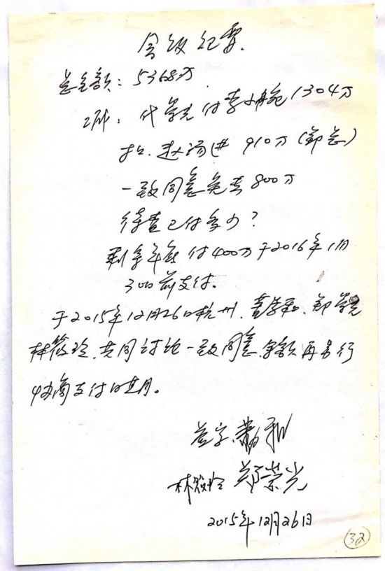 《会议纪要》载明:总金额5368万元;代郑崇光支付李小婉1304万元(李小婉是丁琦的母亲);扣赵汤进910万元;一致同意免去800万元;待查已付多少?剩余年底付400万,于2016年1月30日前支付;于2015年12月26日杭州。董学和、郑崇光、林筱玲共同讨论一致同意。余额再另行协商支付日期。