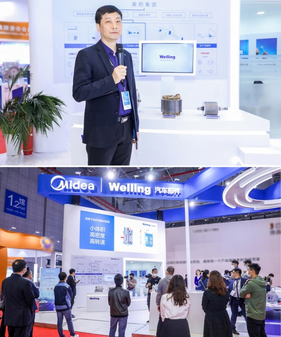 当天上午,在展区观众参观和咨询产品技术的同时,美的威灵汽车部件的新品发布会也在如火如荼进行着。首场新品发布会主角是驱动电机,发布人介绍道,“驱动电机具备高功率密度、高效率、高转速的特点,可适用于纯电动汽车和混合汽车的驱动系统,实现电机驱动提高效率降低能耗。