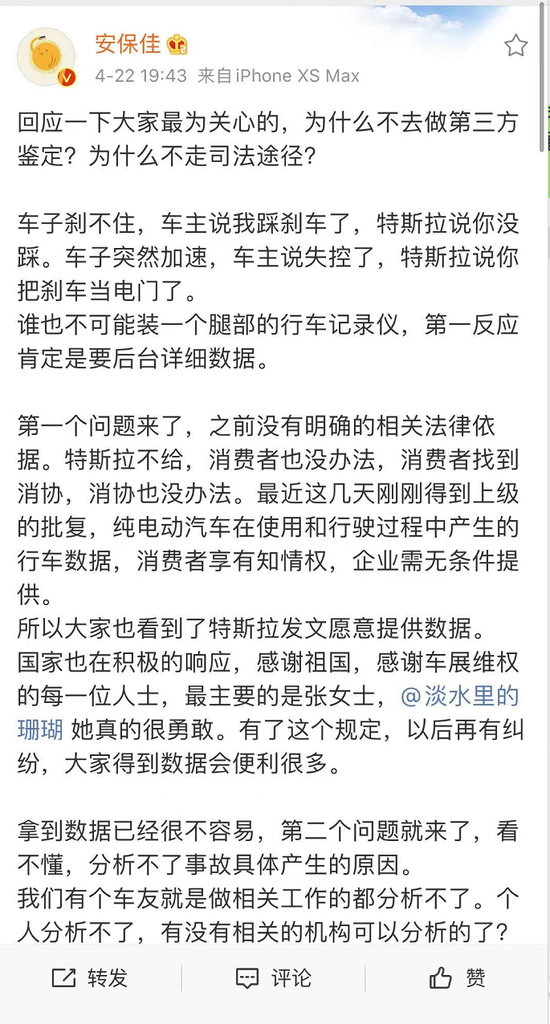 安保佳在微博中首先对特斯拉开始提供数据表示了欣喜。他表示,感谢祖国和维权人士。“之前没有明确的相关法律依据。(后台数据)特斯拉不给,消费者也没办法,消费者找到消协,消协也没办法。最近这几天刚刚得到上级的批复,纯电动汽车在使用和行驶过程中产生的行车数据,消费者享有知情权,企业需无条件提供。有了这个规定,以后再有纠纷,大家得到数据会便利很多。”