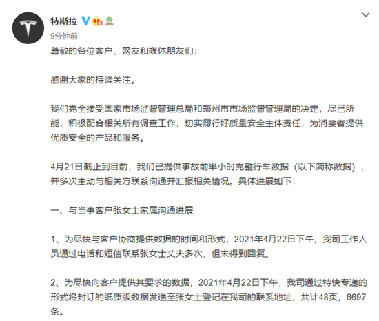 据极目新闻,4月22日下午5时46分,特斯拉相关工作人员告诉记者,22日上午他们已经将加盖公章的数据拿到了郑州市市场监督管理局,但该局工作人员建议,由当事车主来对接接收。