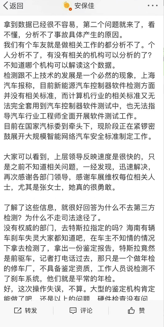 在特斯拉公布数据还原事故一分钟前情况后不久,另一位参与维权的车主安保佳通过微博发声,回应为何不去做第三方鉴定。他表示“检测跟不上技术”,权威鉴定机构难寻成为当下智能汽车争议事故后,车主遭遇的窘境。