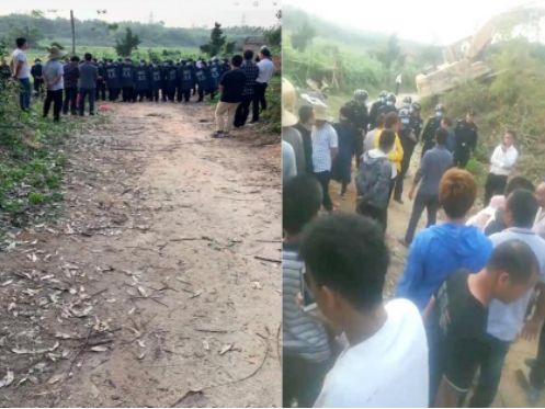 建筑该机耕路,村委会既没有依据《村民组织法》召开全体村民会议,村民代表会议也未通过,又没有公告,强制建设。建设过程中,推毁农作物数十万元,遭村民们抵触,警察镇压施工,村民受伤。个别村民现场讨说法,遭到黄国明的“帮凶”殴打致伤住院,报警“110”,也是不了了之。