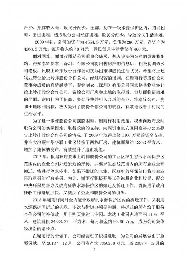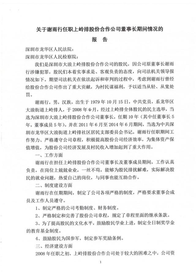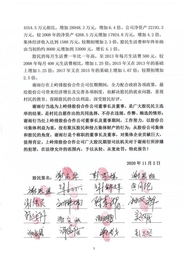 谢雨行涉案后,全体股民自发联名签字向司法机关请愿能够对其从轻、从宽处罚。请愿书中称,谢雨行当选上岭排股份合作公司董事长及董事,是广大股民民主选举结果,是村民自愿做出的共同选择,不存在违规、作弊、贿选的情形,当选董事长后,谢雨行始终以集体利益为重,没有欺压村民和侵占集体财产,对集体企业贡献巨大。