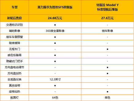 那么赛力斯华为智选SF5这边呢,四驱高性能版也只要24.68万元,后驱版21.68万元,价格是低了不少的。配置层面呈现出的区别倒是有点意思,我们以赛力斯华为智选SF5 四驱版和特斯拉 Model Y 标准续航后驱版作为对比对象,不去考虑动力性能,得出的结论非常有意思。