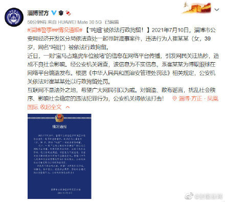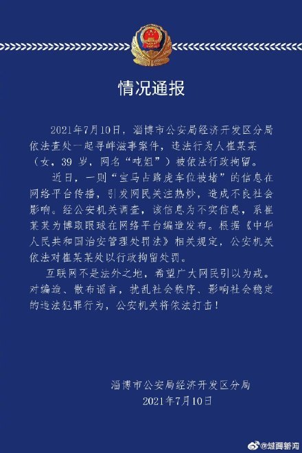 7月10日,@淄博警方 发布通报,“宝马占路虎车位被堵”信息在网络平台传播,引发网民关注热炒,造成不良社会影响。经公安机关调查,该信息为不实信息, 系崔某某为博取眼球在网络平台编造发布。根据《中华人民共和国治安管理处罚法》相关规定,公安机关依法对崔某某处以行政拘留处罚。