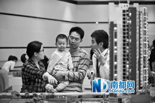 东莞某楼盘售楼处,一对带着孩子的年轻夫妇在看楼。