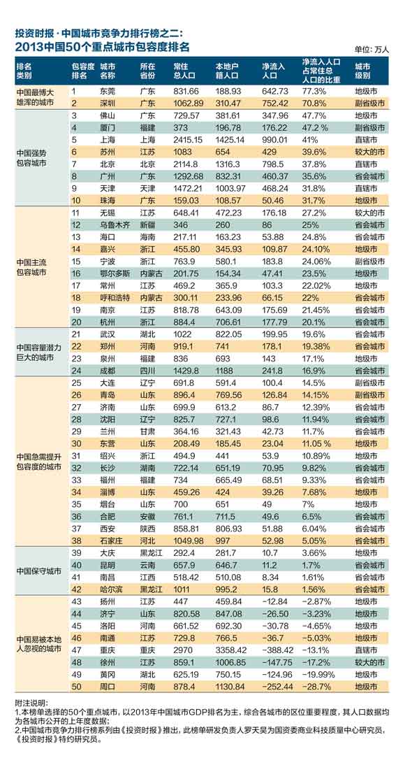 我们的“中国城市竞争力排行榜”本期聚焦城市包容度,推出“2013中国50个重点城市包容度排名”。此榜单的衡量标准为净流入人口占常住人口的比重,以得分高低进行排名。