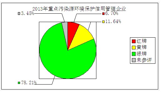 据介绍,在纳入2013年重点污染源环境保护信用管理的1074家企业中,红牌企业(环保严管企业)有72家,黄牌企业有125家,绿牌企业有840家,37家企业由于全年停产、未验收、关停等原因不参与评级。详情见下图: