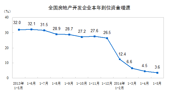 1-5月份,房地产开发企业到位资金46728亿元,同比增长3.6%,增速比1-4月份回落0.9个百分点。其中,国内贷款9379亿元,增长16.5%;利用外资150亿元,下降24.5%;自筹资金18222亿元,增长9.8%;其他资金18977亿元,下降6.4%。在其他资金中,定金及预收款11458亿元,下降8.4%;个人按揭贷款5342亿元,下降1.2%。