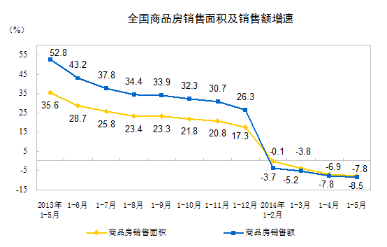1-5月份,商品房销售面积36070万平方米,同比下降7.8%,降幅比1-4月份扩大0.9个百分点。其中,住宅销售面积下降9.2%,办公楼销售面积下降5.8%,商业营业用房销售面积增长0.6%。商品房销售额23674亿元,下降8.5%,降幅比1-4月份扩大0.7个百分点。其中,住宅销售额下降10.2%,办公楼销售额下降14.0%,商业营业用房销售额增长2.5%。