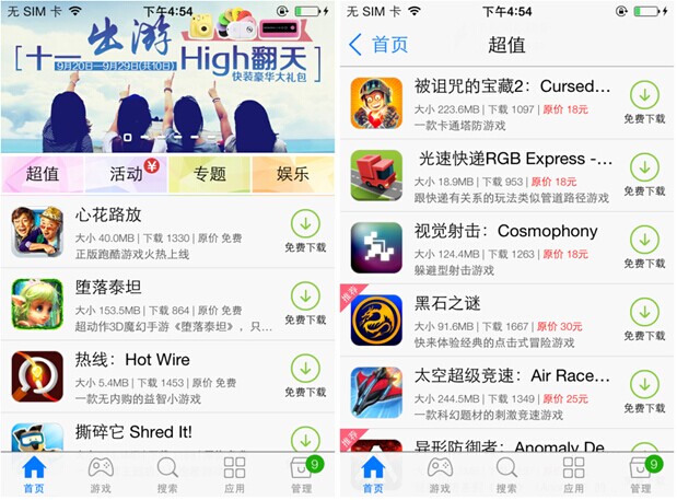 在快装商店里下应用,可以清楚的看到所有应用和游戏的原价,这是快装一个特色功能,俗话说的好,贵有所值,在苹果商店里能飙出高价并被大多数人所接受的游戏,直接说明了该游戏有独到之处,来看看快装商店推荐的游戏,为国庆长假做点储备。从快装商店首页点击进入“超值”频道即刻出发,找超值好玩游戏了。