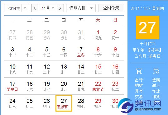 2014感恩节是什么时候?每年11月的第四个星期四是感恩节。2014年感恩节是2014年11月27日,星期四。感恩节是美国人民独创的一个古老节日,也是美国人合家欢聚的节日,因此美国人提起感恩节总是备感亲切。感恩节是美国国定假日中最地道、最美国式的节日(holiday),它和早期美国历史最为密切相关。