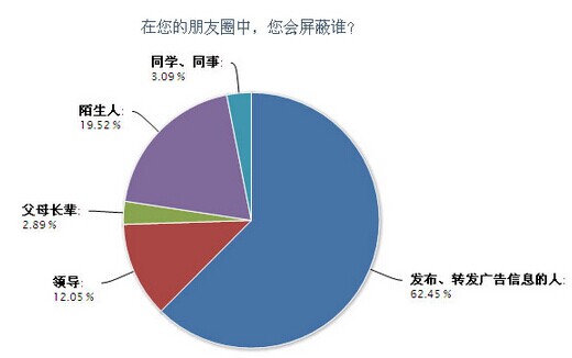 日前,阳光调查推出的“微信朋友圈 您会屏蔽谁”收到1023份网友反馈,超过70%的受访网友在朋友圈遭到过广告信息的困扰,有62.45%的受访者会屏蔽经常发布或转发广告信息的朋友。