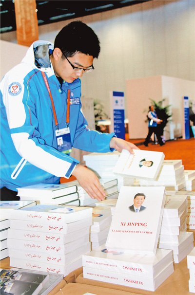 工作人员正在补充摆放多语种版本的《习近平谈治国理政》。