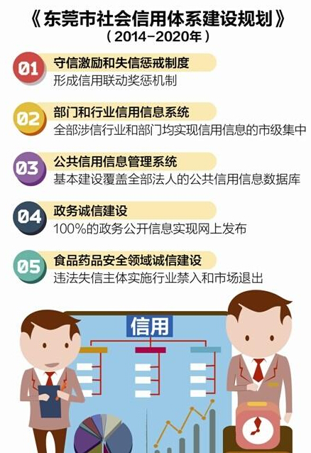 《规划》由市发改局和人民银行东莞市中心支行组织编制,共5章25条,明确提出,到2015年,基本建成与全市经济社会发展水平相适应的社会信用体系框架与运行机制;到2020年,基本建成与国际惯例接轨、符合社会主义市场经济体制和社会治理体制目标要求的社会信用体系,形成新时期东莞诚信文化和诚实、自律、守信、互信的环境氛围。