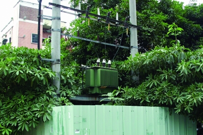 走访:张叔每周都要带上他的孙子到莞城少年宫玩,每到莞城少年宫正门时特意提醒他的孙子小心,因为在少年宫正门,在茂密的绿化树下藏着高压变电器,市民经过时都可以碰到树枝,而茂密树枝已经接触高压电线,遇上打雷下雨生怕电击。