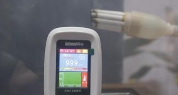在玻璃空间内点燃数支烟后 PM2.5检测仪几秒钟爆表