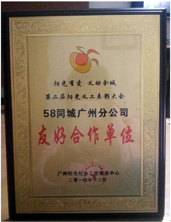 据悉,凭借在广州公益事业的贡献,58同城广州分公司在12月13日阳光社区中心举办的第二届义工颁奖大会中,获得广州市友好合作单位称号。