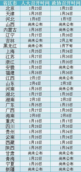 随着1月7日、8日,河北政协和人大会议相继召开,2015年地方两会正式拉开帷幕。根据各地公布的会议日程,大部分省份两会将集中在1月中下旬召开,最晚到2月上旬就会结束。