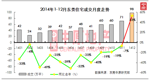 回顾2014年的东莞楼市,从中央至各地救市措施的相继出台,9•30限贷松绑等政策的不断引导,东莞楼市经历年初的淡季,走过不温不火的“铜九银十”,终于盼来了市场复苏的到来,从11月开始,市场成交量同比去年跌幅收窄至7%,再至12月住宅成交量暴增至98万平,同比去年大幅上涨53%,创下历史同期新高。