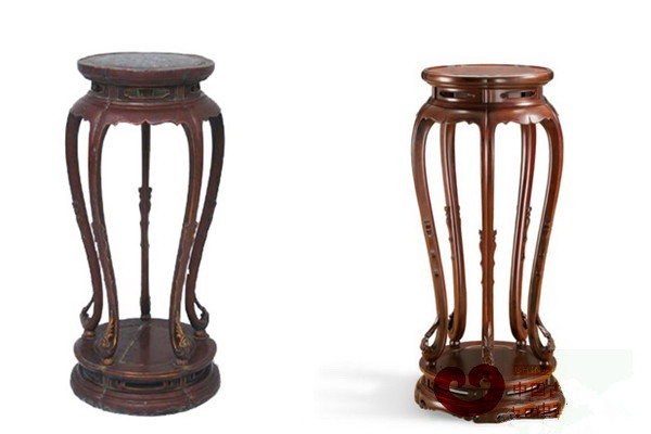 故宫红漆嵌珐琅面梅花式香几(左),区氏改制大红酸枝梅花几(右)