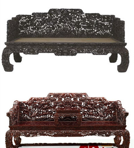 故宫典藏紫檀荷花纹床(上),区氏改制透雕莲叶荷花纹长床(下)