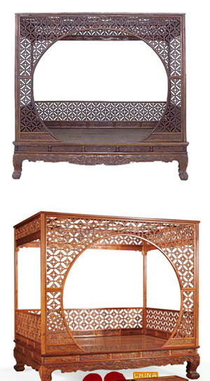 故宫典藏黄花梨月洞门架子床(上),区氏改制黄花梨如意云月洞架子床(下)