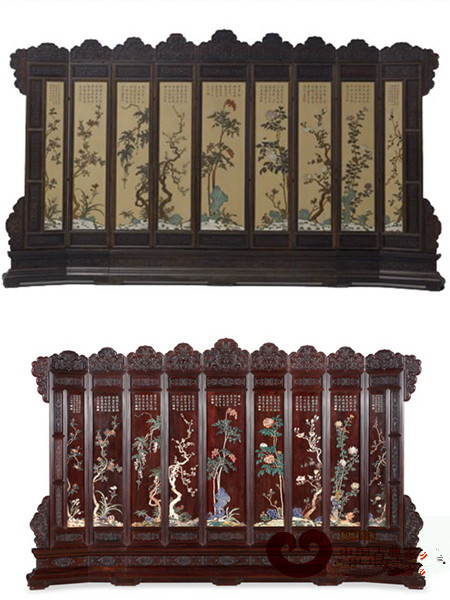 故宫典藏紫檀边座嵌玉石花卉宝座屏风(上),区氏改制小叶紫檀嵌百宝花卉九扇地座屏(下)