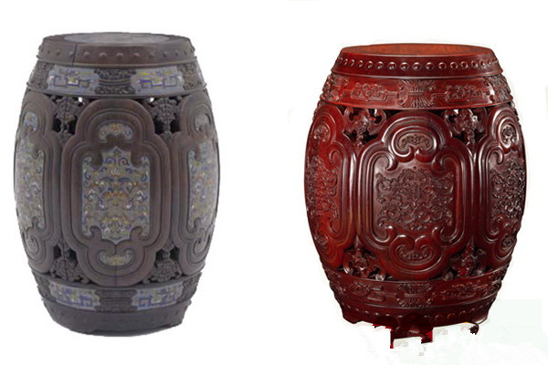 故宫典藏紫檀嵌珐琅绣墩(左),区氏改制小叶紫檀西番莲纹坐墩(右)