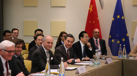当地时间3月29日,在瑞士洛桑,中国外交部长王毅(中)出席伊核问题外长会。