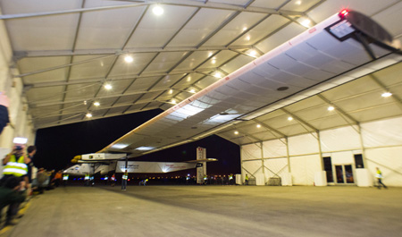 图为当日凌晨,在重庆江北国际机场,“阳光动力”2号太阳能飞机进入专用机库。(记者 刘潺)(来源:经济参考报)