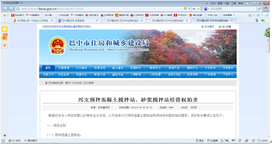 资料显示,公司营业执照办理日期为2012年2月24日,同日办理了税务登记证和组织机构代码证,除了杨平所述的口头申请外,书面资料证明;《建筑业企业资质申请表》的填报日期为2012年4月22日。截图资料(记者已打开网页核实查证)显示,巴中市住房和城乡建设局官方网站上的拍卖公告发布日期是2012年5月30日,公告上未载明拍卖日期。拍卖项目名称为“兴文预拌混凝土搅拌站和预拌砂浆搅拌站经营权”,项目地点为巴州区清江镇佑垭村三社猫儿石湾。而恒基商品混凝土有限公司搅拌站的地址也是同一地址。记者询问杨平这是怎么回事,杨平称我们也不清楚怎么会这样。我们是按正常手续与当地的集体组织签订了土地租用合同。