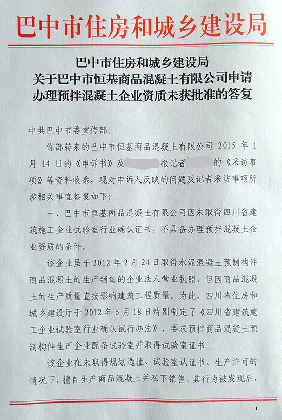 随后,杨平向记者详细介绍了企业建立至今的状况:我97年退伍后就一个人在浙江打工,2007年响应家乡号召回到老家巴中创业,从事建筑行业的工作,为家乡建设贡献一份力量。由于市委政府提出推进巴中统筹城乡、建设宜居宜业宜商的新巴中,我们几个退伍老兵商议后决定,将多年打拼积累的资金投身于家乡的建设。2012年初,一家修建高速公路的公司完工撤场后,要将遗留的混凝土搅拌站处置变卖。闻此信息后,经过我们几个老兵考察市场、集中自有资金、追加部分贷款将其买下。改建成一个规模化、规范化的高标准商品混凝土搅拌站。按照法律规定和行业规定办理了一切前期注册等相关手续,创建了恒基商品混凝土有限公司 。由于《建筑业企业资质证书》和四川省建筑施工企业试验室《行业确认证书》是属于企业生产建设的后置办理手续,我们公司在建设完善了搅拌站后,依照程序立即向巴中市住建局下设的“巴中市散装水泥办公室”提交申请所需的全部资料。可是,由于我是军人性格,做事做人直来直去,不懂得巴中混凝土行业申报时的一些潜“规矩”,被不断地“打太极、耍柔道”。到了2012年5月30号,我们被告知:巴中市人民政府