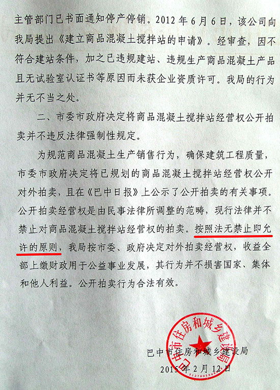 2、答复中所述“该企业在未取得规划选址、实验室认证书、生产许可证的情况下,擅自生产商品混凝土并私下销售”。那么,为何在巴中市住建局的拍卖项目公告上,规划选址又与恒基商品混凝土有限公司的生产地址完全相同呢?只能说明,规划选址就在此地,不管此地有无企业,经过拍卖给了钱才算你的。这算什么?难道不是强买强卖吗?实验室认证书和生产许可证的申请办理,都是企业建设完善后的后置审批程序。企业不建立实验室、不生产出产品,如何提供产品质量检测样本?公司的产品当时送巴中市建设工程质量检测中心进行了检测,并取得了全部产品合格的检测报告。企业年年向国家缴纳税款从未拖欠,何来擅自生产和私下销售一说?巴中市住建局为何根本不受理企业这两个证书的申请?说白了就是凭空设立一道收费门槛!这难道不算权力勒索吗?住建局这两年已经拍卖了一亿多的资金,这么多的资金都去了哪里?
