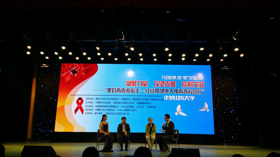 在防艾主题晚会中,防艾宣传员蔡国庆、红丝带健康大使陈瑾与防艾专家进行了现场对话,并与同学们亲切的互动交流。之后,山大学子们还表演了诗朗诵、相声等精彩的防艾节目,无伴奏演唱组合——“人声兄弟”唱响了《一点一滴》,“不老男神”蔡国庆与同学们齐声合唱了《同一首歌》……