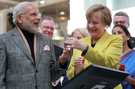 2015年汉诺威工业博览会13日正式对公众开放,本届展会主题为“融合的工业-加入网络”。印度是此次展会的合作伙伴国。图为当日在德国汉诺威,德国总理默克尔(右)和印度总理莫迪(左)参观汉诺威工业博览会展区。(记者 罗欢欢)(来源:经济参考报)