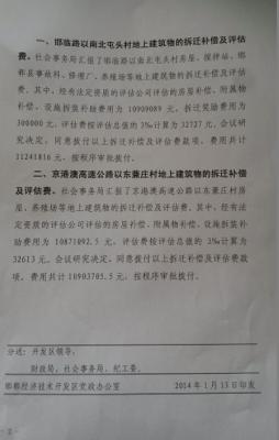 然而,更让裴连生没想到的是,在这期间,他意外地获得一份《邯郸市经济技术开发区管理委员会主任办公会议纪要》。该会议纪要主要记录的主要内容是,有关邯临路以南北屯头村地上建筑物(也就是裴连生承租的土地)拆迁补偿和评估费的问题。文中称:社会事务局汇报了邯临路以南北屯头村房屋、搅拌站、邯郸县事故科、修理厂、养殖场等地上建筑物的拆迁补偿及评估费。其中,经有法定资质的评估