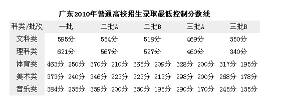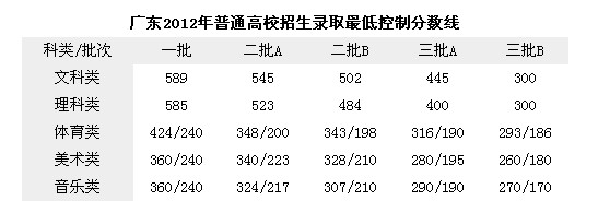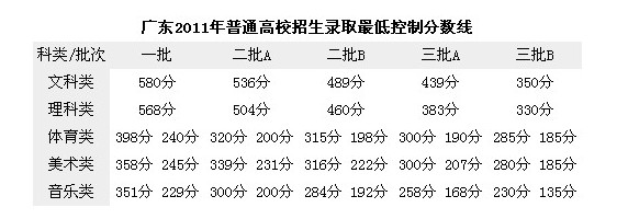 今年广东省普通高校各批次录取最低分数线情况如下: