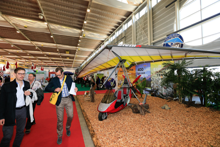 4月15日,在瑞士日内瓦Palexpo展览馆,参观者经过瑞士人哈维尔·罗塞特设计的动力滑翔机。
