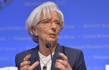 4月18日,在美国首都华盛顿,国际货币基金组织总裁拉加德在新闻发布会上讲话。 鲍丹丹/摄