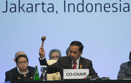 4月23日,在印度尼西亚首都雅加达,印尼总统佐科(前)在亚非领导人会议闭幕仪式上落槌。专家认为,亚非合作的内容已从原有的中国提供援助、双边多边经贸,进一步扩展到系统性建设和制度性安排,既包括连接亚非的海陆通道,也包括促进亚非国家之间贸易投资的制度安排。(记者 吕小炜)(来源:经济参考报)
