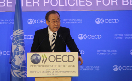 4月28日,联合国秘书长潘基文在经济合作与发展组织位于巴黎的总部发表演讲。潘基文表示,现有的国际投融资机制已难以满足各国可持续发展需要,国际社会应加强合作,争取达成新的协议,以改善现有的国际投融资机制,促进可持续发展。(记者 韩冰)(来源:经济参考报)