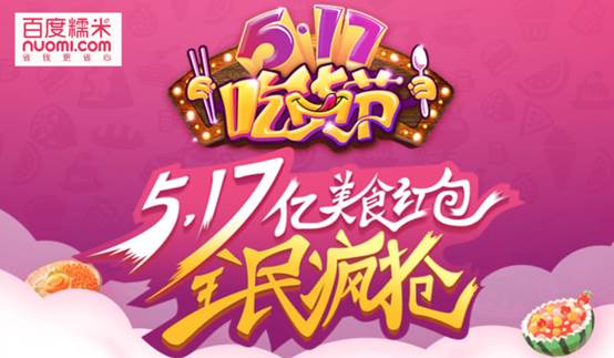 据悉,本届吃货节,百度糯米发动全部力量、联合全国数千商户展开了一场主题为“5.17吃货节,5.17亿红包全民疯抢”的全方位的优惠盛宴,并从16日起进入最高潮!
